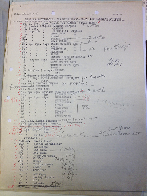We found a lot of great photos Boyd took on her expeditions to Greenland and the Arctic. The photos in her books about Greenland are pretty stunning landscapes in ice and snow-covered mountain and sea that look like these arty, Rorschach Test-like, sculptural abstract universes. And most fascinatingly, we found files and files filled with her meticulous receipts to Abercrombie & Fitch (she was s serious customer, ordering all kinds of custom gear) and long long lists of food provisions and gear.